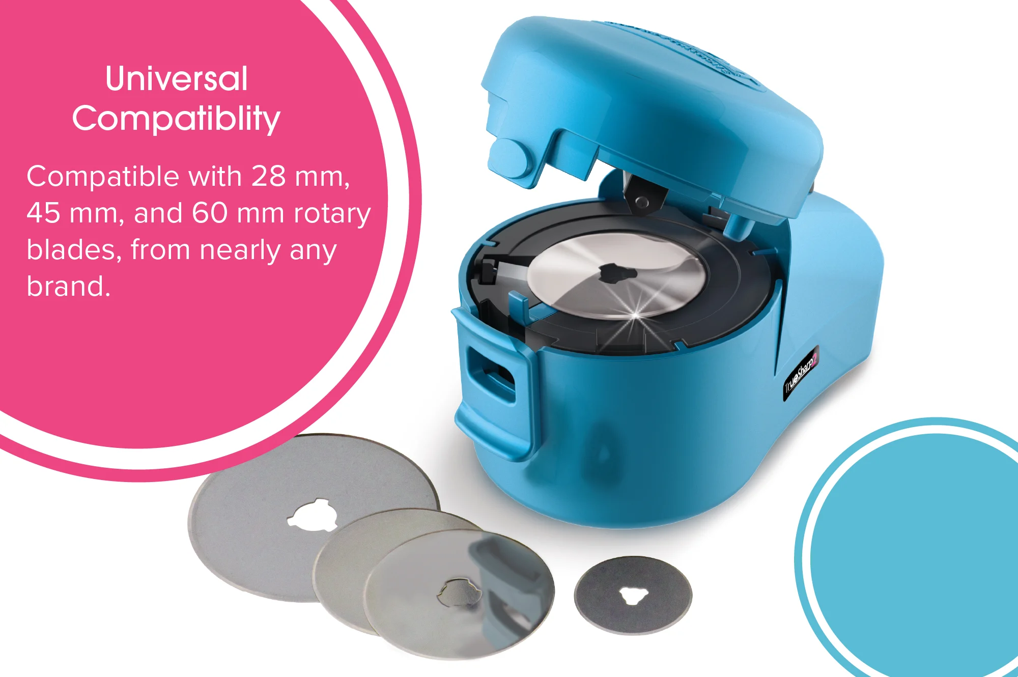 - Sharpens 3 sizes of rotary blades – 28mm, 45mm and 60 mm